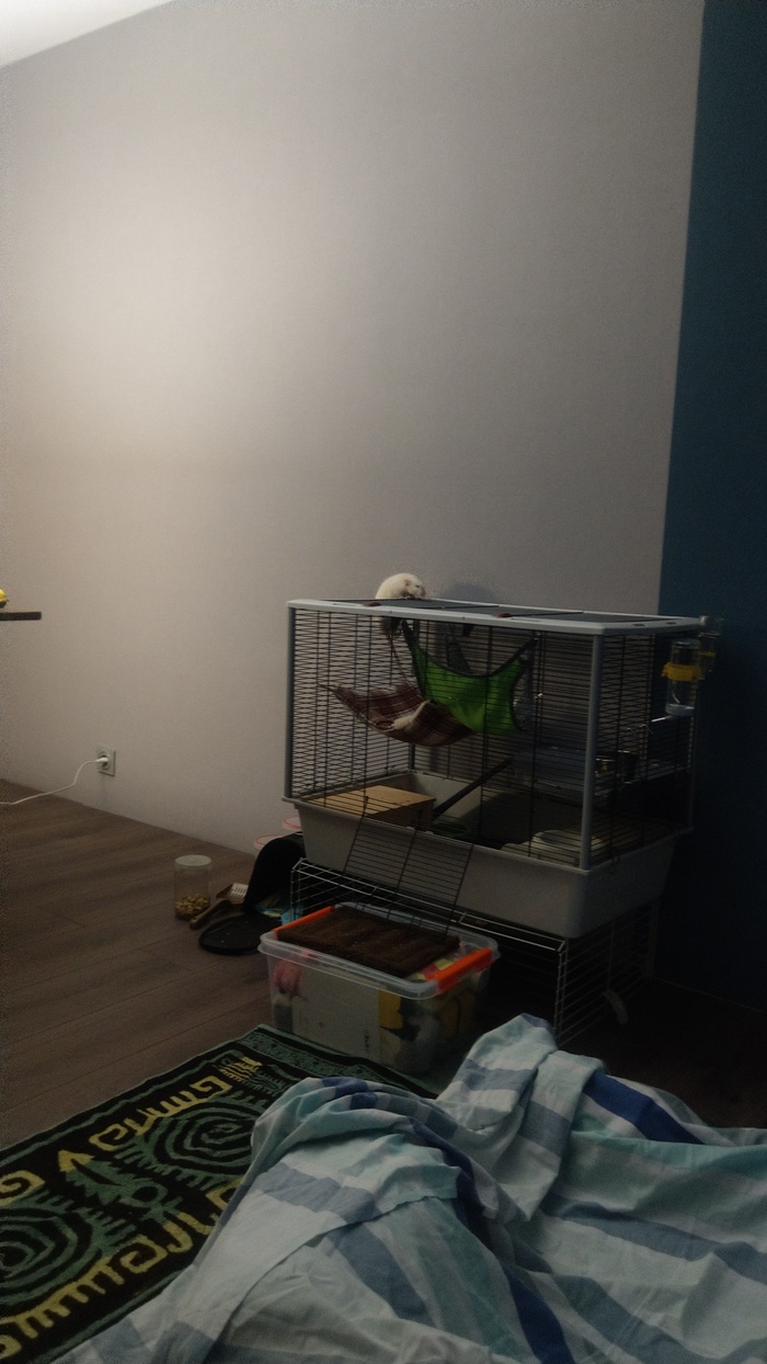 На фото это она вскоре после покупки. Любит спать сверху клетки. И вообще осторожничает. Сначала вообще перемещалась только прыжками.