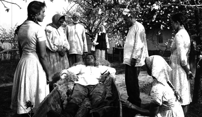 В цветной съемке Рерберга среди подсолнухов, садов, возов и волов открываются порталы, золотые ворота в вечность. Я люблю в этом фильме эпизод «Гибели богов», решенный Рерберго и Солнцевой в форме крестного хода — камера обходит храм изнутри. Правда, и здесь картину открывают отредактированные слова Довженко, неизвестно кому адресованный монолог: «Я принадлежу человечеству как художник, и ему я служу…» Посмотрите и сравните с оригиналом дневника, обращенным не к читателю‐зрителю, не к власти и не к миру вовсе.