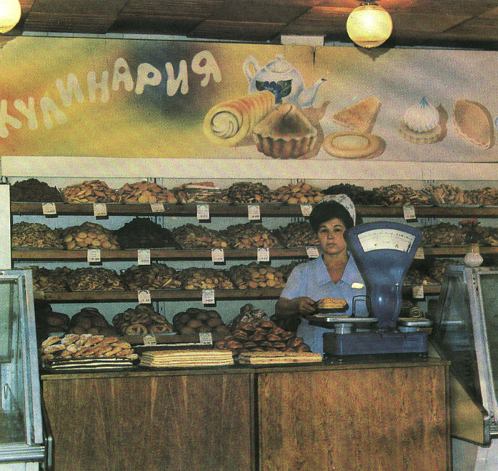 11. В центральной кулинарии всегда, то есть вообще всегда можно было купить вкусняшек. Я просто обожал треугольные булочки с повидлом и рогалики, которые можно было разрезать, намазать половинки маслом, склеить и съесть с чаем. На фото кстати можно увидеть слоеные пирожные "Стефания". Я их не очень любил, но и не отказывался, когда мама покупала их по дороге с работы.