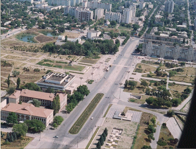 6. Центр, площадь Суворова. Сейчас она очень изменилась, но я еще помню ее почти такой. В правом нижнем углу видно кусочек набережной Днестра, слева - школа №6, элитное учебное заведение, в 90-х - с углубленным изучением английского. Сейчас - гуманитарно-математическая гимназия. Ну и рядом - Дворец пионеров, куда я ходил на кружок астрономии.