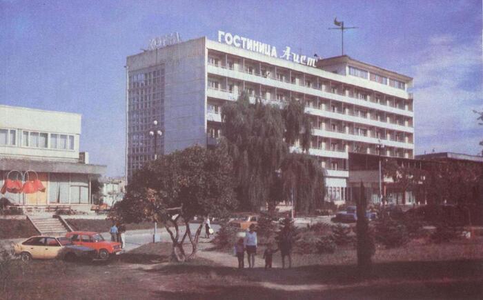 7. Еще одна достопримечательность площади Суворова - гостиница "Аист" на берегу Днестра. Год определить проблематично, то ли конец 80-х, то ли самое начало 90-х. Слева - зонтики кафе "Сказка", или, как мы его называли, кафе-мороженое. Сейчас его перенесли правее, если смотреть по этому снимку.