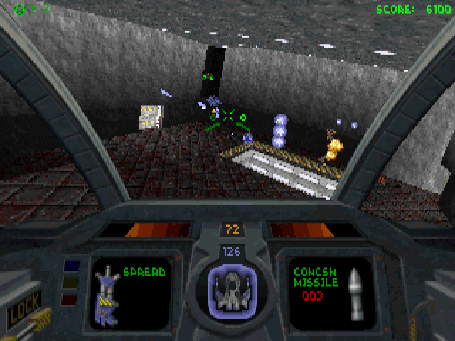 На скриншоте выше - "Descent", первый шутер от первого лица в полном 3D. Концепцию этой игры задумали ещё в 1993 году Майк Кулас и Мэтт Тошлог, выходцы из компании LookingGlass Technologies, которая была пионером в области разработки иммерсивных 3D-игр ("Ultima Underworld", "System Shock") и тесно сотрудничала с Origin (создателями "Wing Commander").