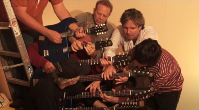 На фото - Рик Нильсон, гитарист Cheap Trick и счастливый обладатель гитары "5 в 1". Сверху вниз: 12-струнная, 6-струнная, 6-струнная, 6-струнная, 6-струнная без ладов. Рик носит гитарный ремешок, но большая часть веса приходится на табуретку (ее на фото не видно).