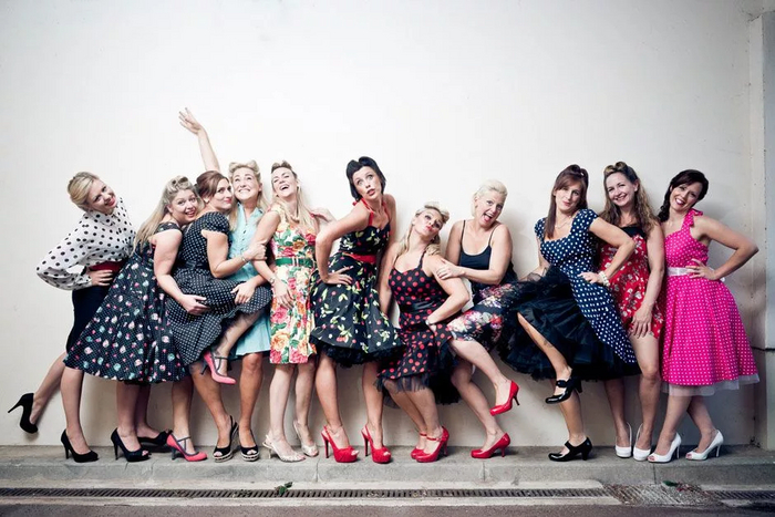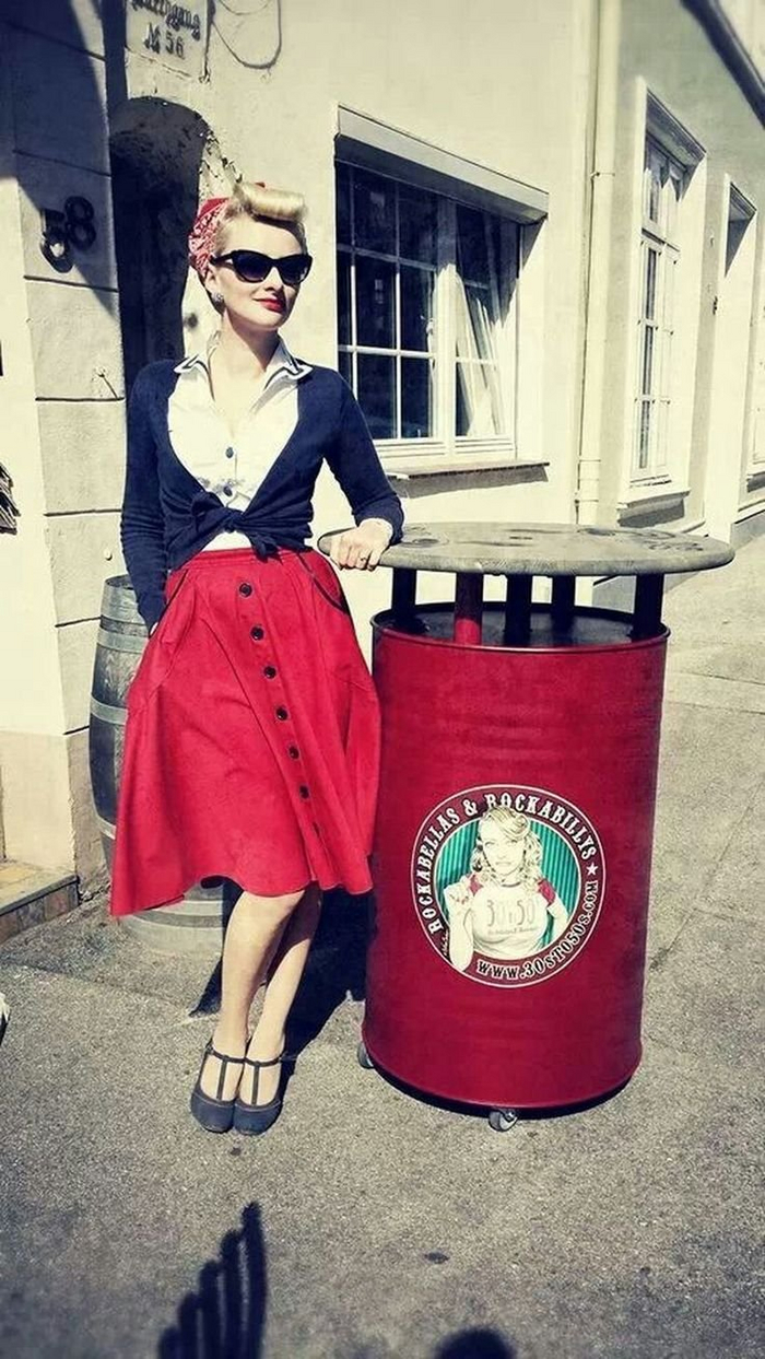 Яркие цвета (правило «не сочетать больше трёх цветов» важно и здесь), фигура «песочные часы», что зачастую достигается широким поясом, браслеты, серьги и бусы из обычной пластмассы. Стрелки на глазах и маникюр в цвет помады. А помада, как и жизнь «рокабильщицы» - всегда яркая. И если женская мода в одежде и макияже довольна проста, то прически всегда являются произведением искусства.