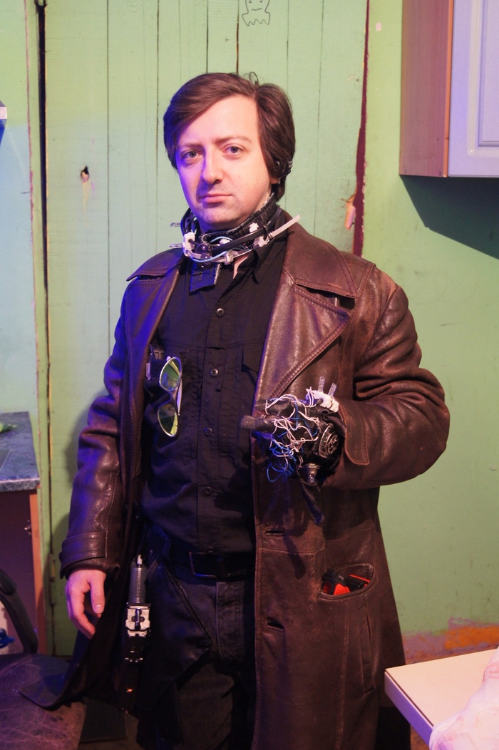 Вообще, на игру я попал почти случайно - меня попросили заменить другого игрока, я согласился. Потому как мне показалась интересной роль, по киберпанку я вообще в ролевой жизни не играл, так что принял предложение. Знакомьтесь, Дэвид Шинода, сын богатой семьи, но твердый противник корпораций. Вместо левой руки - протез, на шее адреналиновый усилитель, правая рука укреплена имплантами. На данный момент - один из лидеров бунтарей против корпораций.