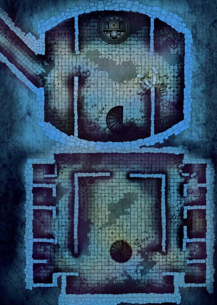 Перед вами завершение карты Крепости, обращенной к Солнцу. С поверхности через пролом в древней каменной стене спускается пандус из утрамбованной глины. Он ведет в помещение, наполненное пылью и застоявшимся воздухом. На вершине низкого помоста к северу стоит алтарь, украшенный резными подсвечниками, неглубокой чашей и стилизованными языками пламени. На юге винтовая лестница ведет вниз. На востоке арка ведет в другое помещение-бывшие общежития. Винтовая лестница ведет на нижний уровень, где навалены инструменты и ящики и забаррикадированная комната... Винтовая лестница на юге из этого помещения ведет на лестницу и в пещеру с пропастью (предыдущая карта)