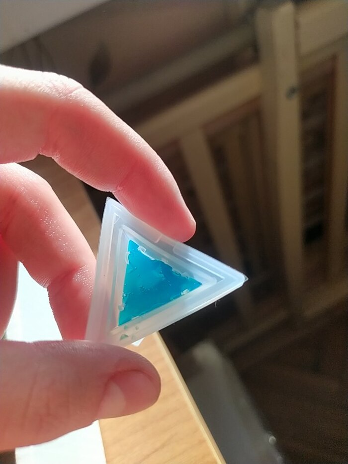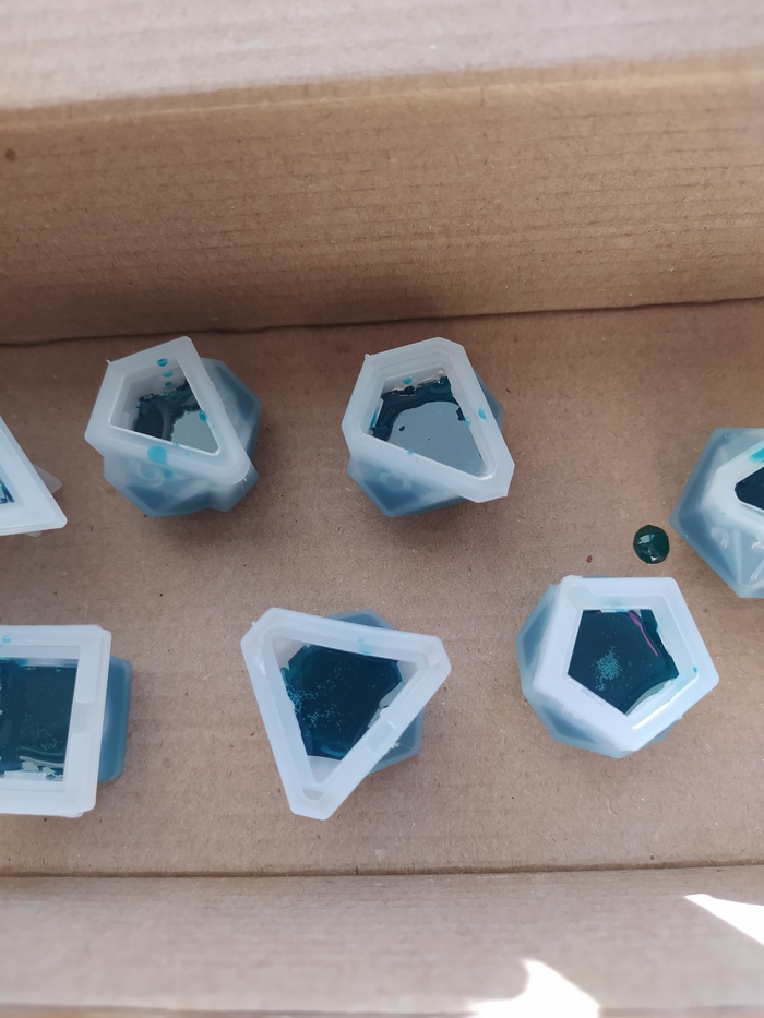 Надоели свои старые дайсы, решила попробовать сделать самостоятельно. Докупила эпоксидки, заказала формочки, начала фигачить. Тупанула, срукожопила,и вышла какая-то фигня... Из-за крышечек не вышел воздух, верхние грани пошли пузырями. Надо использовать другую стратегию...