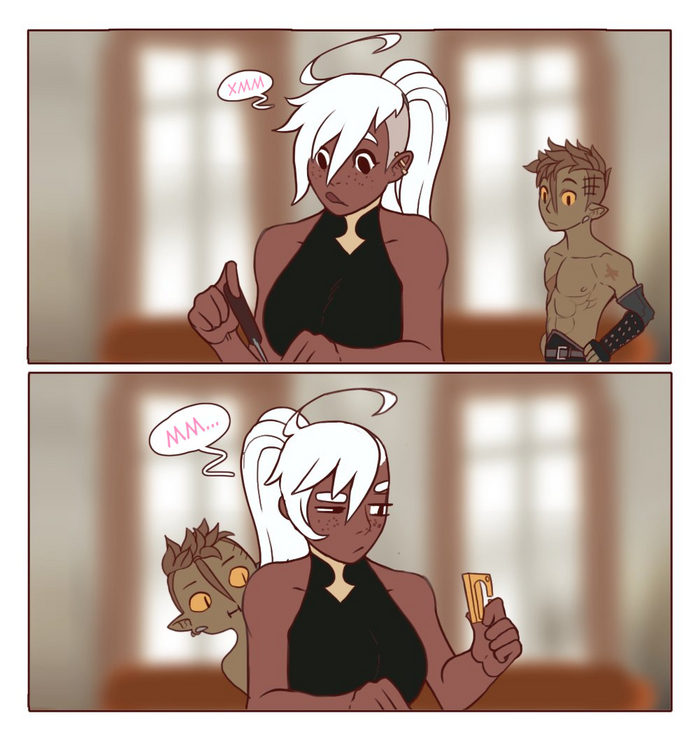 Перейдем к другим участникам отряда. Еще один наш орк, Гром решил поговорить с одиноким мальчишкой. Это оказался сын Малори, Дорэн. От него он узнал, что чудище не выдумка и мальчик видел его у леса на окраине городка, оно светилось и было покрыто чешуей. Ари также задала парнишке несколько вопросов, но ничего интересного узнать не удалось. Гром взял обещание с мальчишки, отвести нас к тому месту где он видел чудище последний раз. Дорэн согласился не сразу, но был слишком восхищен добрым орком. Собравшись за стойкой компания перекусила что боги послали. Стили же отрывался по полной, а именно пытался сделать себе стул из стола, так как стандартный ему явно не подходил. Сидящий за столом пьяный в стельку мужик вообще мало понимал что происходит. Ари урезонила конструкта, а Гром бережно подхватил мужчину. Вернув ему стол, приключенцы решили расспросить местного подробнее, за неимением лучшего варианта. Рэд, местный пьяница, поведал им свою грустную историю, что потерял буквально всё в этом проклятом месте и ищет спасение на дне бутылки. Мы пытались его приободрить, но всё тщетно. Внезапно, человек встал и пошел на выход из таверны, он заинтересовал нас и мы двинулись за ним в подворотню. Пройдя недалеко, Ред шлепнулся в грязь и остался лежать без чувств. Поколдовав над ним немного и приведя его в чувство мы узнали о загадочной пропаже его дочери, но большего не добились. Оставлять беднягу на улице было нельзя, понесли обратно в таверну, чтобы снять ему номер на день. При входе в таверну был слышен тихий разговор со стороны стойки. Лайт решил подслушать о чем идет речь. Малори агрессивно отчитывала Бретта, за то что тот пялился на ее дочь. Лайт не успел вовремя отойти, и встретился с хозяйкой, но отговорился под предлогом что хотел сделать заказ, да не было никого. Хозяйка была крайне недовольна что принесли пьяницу и не собиралась оставлять Рэда, но наш Стили стал мастерски с ней торговаться и всего за два медяка мы пристроили мужчину. Малори сказала что Рэд типичный пьяница растрачивающий жизнь на спиртное, Ари спросила а как же тогда его дочь? "Да это небось кочерга какая-то любимая его, нет у него дочери" - последовал бесчувственный ответ. Лайт тут же упрекнул ее в отсутствии сердца, для существа из плоти и крови.