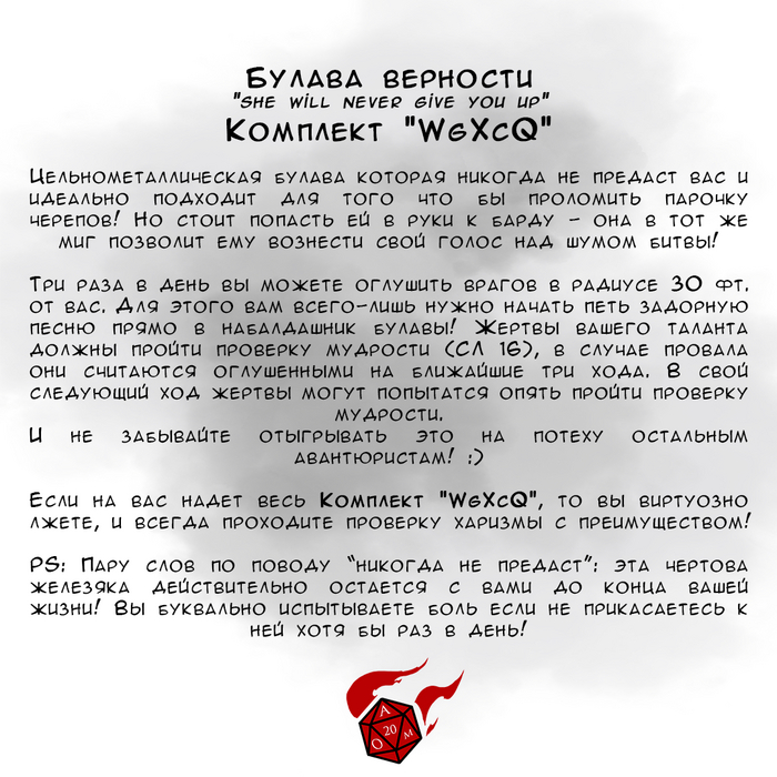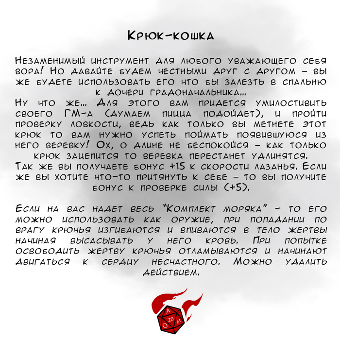 Вот, собственно, и всё. 2d4 комментариев для минусов, я оставлю, вместе с собственным объявлением (отважные авантюристы всё ещё нуждаются в Мастере!). Правила я, вроде бы, не нарушил, а если есть советы по лучшему оформлению/организации этого всего - милости прошу.