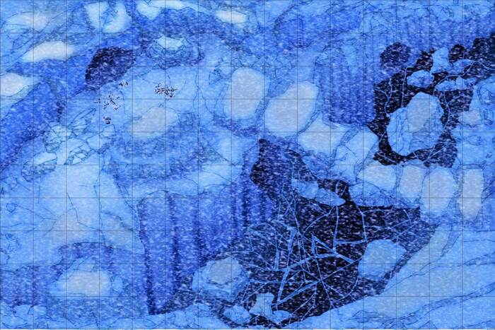 Река , закованная в лед, мост из снега и льда, пещеры, явно обитаемые, ледяные глыбы. Ночной вариант и снегопад ночью.