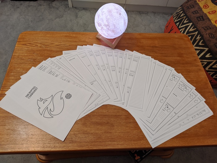 На данный момент для одного персонажа предусмотрено где-то 31 страница А4. Туда входят 10 страниц книги заклинаний (всего 90 заклинаний), страницы компаньонов, и все, что есть на стандартном листе персонажа для D&D пятой редакции в расширенном и более удобном для поиска информации виде. Если печатать с двух сторон, то  страниц получается 16. В мои планы входило распечатать блокнот с двух сторон и поместить туда страницы на двух персонажей (32 в сумме).