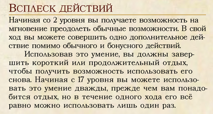 На втором от воина даётся всплеск действий. Это позволяет нам получить второе основное действие в ход. Конечно, восстанавливается на коротком отдыхе, но всё равно приятно. Ведь уже на таком уровне мы можем выдать две атаки, где каждая будет наносить около 17 урона.
