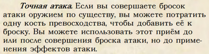 Он позволяет нам выбрать три приёма, которые могут влиять на наши действия в бою. Самым важным приёмом будет Точная атака. Он позволяет нам кость превосходства в размере 1д8 добавить к броску попадания после броска, но до результатов. Это в среднем плюс 4.5 к попаданию. Т.е. одной костью превосходства мы как бы нивелируем штраф на попадание.