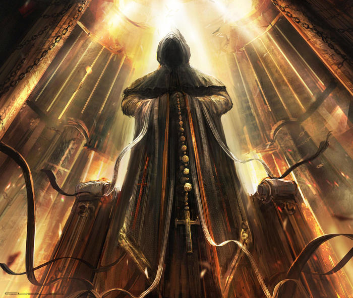 Лестница была слабо освещена призрачными огнями, в конце которой стояла статуя Первого чародея, покрытая пылью и паутиной. Статуя возвышалась над моей головой на метров 10. Тело статую покрывала длинная мантия, руки были скрыты рукавами, а из под капюшона виднелись лишь еле уловимые черты лица.