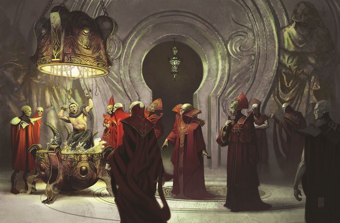 Нам нужно было незаметно добраться до катакомб и поэтому Деместос создал образ обвала, состоящего из обломков стен и часть зала мы пробежали незамеченными. Зона действия образа заканчивалась и нужно было готовиться ко встречи с врагами, но как только мы вышли из образа, вокруг Тайре образовалась аура непроглядной тьмы и он попросил держать друг друга за плечо и дальше передвигаться одной колонной, как отряды специального назначения при штурме. В этот момент я почувствовал себя слепым котенком, потому что дварфийское темное зрение здесь мне никак не помогало и оставалось полагаться лишь на плечо впереди идущего Финливарда и собственный слух.