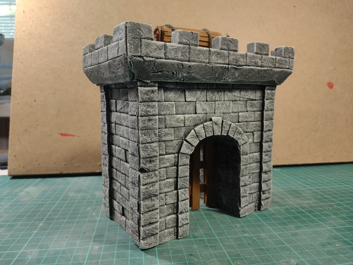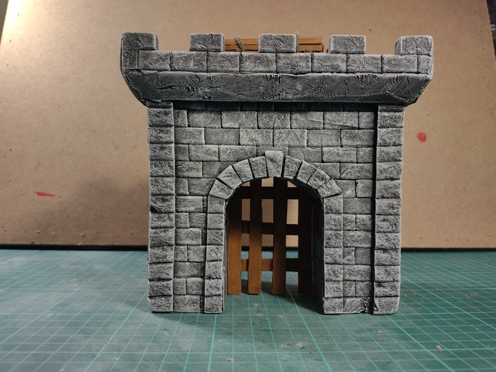 Что использовал: экструдированный пенополистирол, пенокартон, деревянные палочки, клей-пистолет, затирка для плитки, акриловая краска (черная, серая, светло-серая).