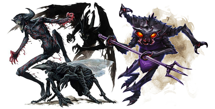 Несколько разных тварей (Бабау, какой-то жук с трезубцем (Меззолот) и Теневой демон) окружили Деместоса. Жук из своих жвал выплюнул черную слизь, оставляющую за собой черное облако, подобное тому, что выходило из Тайре. Бабау когтями поцарапал металлические доспехи Деместоса и они начали разогреваться.