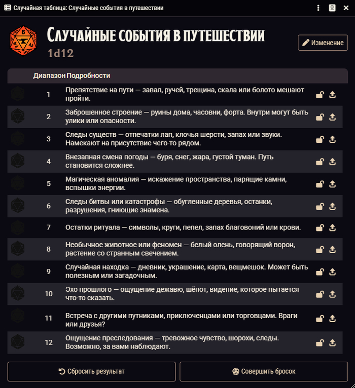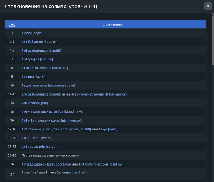 Столкновения — это, как правило, боевые ситуации. Я проверяю их примерно раз в час внутриигрового времени (или чаще, в зависимости от региона). Совершается бросок d20: при результате 18–20 (15% шанс) кидается d100 и выбирается существо из таблицы региона.