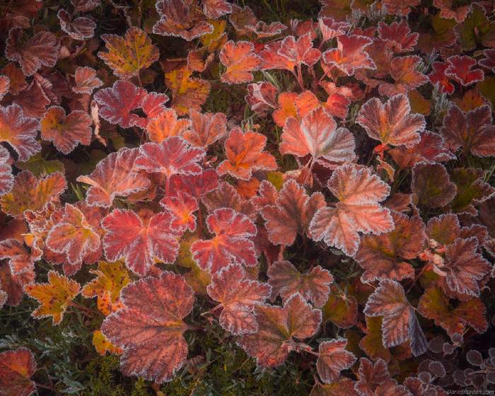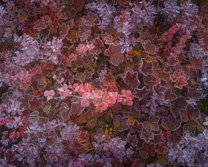 "Ковры тундры невероятно красивы, особенно после утреннего морозца, когда листики покрываются ажурной серебристой кромкой. Как осенние цветы или бабочки, присевшие отдохнуть на зиму"