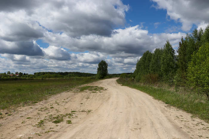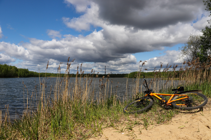 Настроение отличное и в какой-то момент я поймал себя на мысли, что домой я совсем не хочу, по крайней мере пока. Обычно катаясь на велике слушаю музыку, тут же наоборот слушал окружающий мир, мне нравился звук машин, птиц, мимолётные разговоры прохожих, а в голове шел мыслительный процесс, точно не помню о чем я тогда думал, но помню точно о чем-то хорошем. Дорога была шикарная, с новой разметкой, а также широкая асфальтированная обочина, отделенная сплошной линией, по которой двигался я не мешая машинам, но в какой-то момент дорога сузилась, сплошная пошла по самому краю дороги. Мне пришлось двигаться чуть левее от сплошной, чтобы случайно не слететь с дороги, а возвращаясь обратно не упасть на проезжую часть из-за заноса заднего колеса. Места на одной полосе было только для одного грузовика, поэтому для обгона меня, требовалась чистая полоса встречного движения! Все было хорошо, все меня обгоняли, оттормаживались, если встречка была занята, но в какой-то момент я услышал пронзительный сигнал грузовика у себя за спиной, который меня заставил немедленно слететь на гравий. С трудом, но я удержался на велосипеде и не упал, конечно я материл этого дальнобойщика на чем свет стоял. Мне до сих пор не понятно, на кону человеческая жизнь, а тебе нужно только педаль тормоза нажать, пропустить встречный автомобиль, а после безопасно обогнать велосипедиста. Он же выбрал лететь до конца, а после до усрачки напугать человека. Вообще как вы понимаете очень не приятный эпизод, но я довольно быстро о нем забыл, так как вечерело, был уже девятый час и скоро должно было стемнеть. Я стал думать где я буду проводить свой первый ночлег. И вообще ехать на велике по дороге, любуясь окружающим миром, это одно дело, а ночевать одному в лесу, совсем другое (кто пробовал тот поймет о чем я). Заехав на заправку стал изучать карту, искал хорошее место с водоемом, но сложность в том что я не знаю этих мест, тогда я подъехал к заправщику. Это был мужик лет 58-60, поздоровавшись с ним, спросил где здесь есть водоём, река или озеро и хорошее место где можно поставить палатку для ночлега. Он мне сказал что через 5-7 км по ходу моего движения, будет поворот налево, а после ещё примерно 1,5-2км будет деревня Плоское, там протекает река Луга, на песчаном берегу которой можно спокойно заночевать. Поблагодарив его, тронулся дальше, я начал торопиться, во-первых потому что уже понемногу темнело, а во-вторых мне нетерпелось попасть на это место и поскорее поставить палатку. Проехав совсем немного от заправки, я увидал в далеке на дороге, справой стороны яркое пятно, сначала я подумал что это мотоцикл стоит на обочине, но приблизившись ближе я увидел велосипедиста, в яркой оранжевой желетке, как у дорожного рабочего, в тот момент подумал что это гастарбайтер едет домой, когда до него оставалось около 300 метров, он свернул направо в лес и я смог различить его, оказалось что желетка была привязана к багажнику, а точнее к велоштанам на багажнике, что спереди у него тоже были какие-то сумки, а также рюкзак за спиной. Стало ясно это тоже велопутешественник, я помчал за ним, в тот момент когда доехал до поворота, он как раз выезжал откуда. Я поздоровался на английском и спросил откуда он, сам не знаю почему я подумал что он иностранец!) Он меня не понял, я спросил по-русски, понимает ли он меня. Короче говоря заб