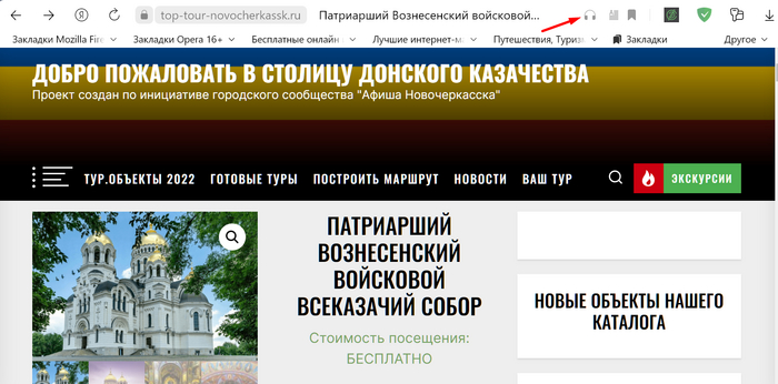 1) Перейти по ссылке: Патриарший Вознесенский войсковой всеказачий собор города Новочеркасска в Яндекс Браузере;2) Немного прокрутить страницу вниз, и нажать на кнопку с изображением наушников, как показано на рисунках ниже: