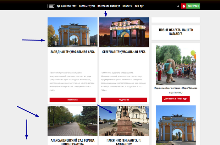 В зависимости от установленных фильтров пользователь сайта(потенциальный турист) сможет увидеть список подходящих по его запросу туристических объектов города Новочеркасска и изучить их подробнее перейдя в карточку туристического объекта.
