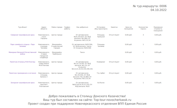 С помощью распечатанного туристического маршрута потенциальный турист может либо сам составить график и способ посещения выбранных туристических объектов, либо обратиться в один из туристических центров города Новочеркасска, которые (за дополнительную плату или бесплатно) организуют ему посещение данных туристических объектов.