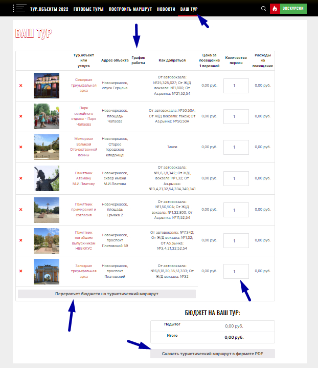 Исходя из своих потребностей посетитель сайта может произвести перерасчет стоимости своего туристического маршрута, в зависимости от увеличения или уменьшения персон, которые планируют посетить туристический объект. Для этого пользователю сайта необходимо в соответствующей графе туристического объекта изменить количество персон, которые планируют посетить туристический объект в рамках его тура, после чего нажать на кнопку “Перерасчет бюджета на туристический маршрут”.
