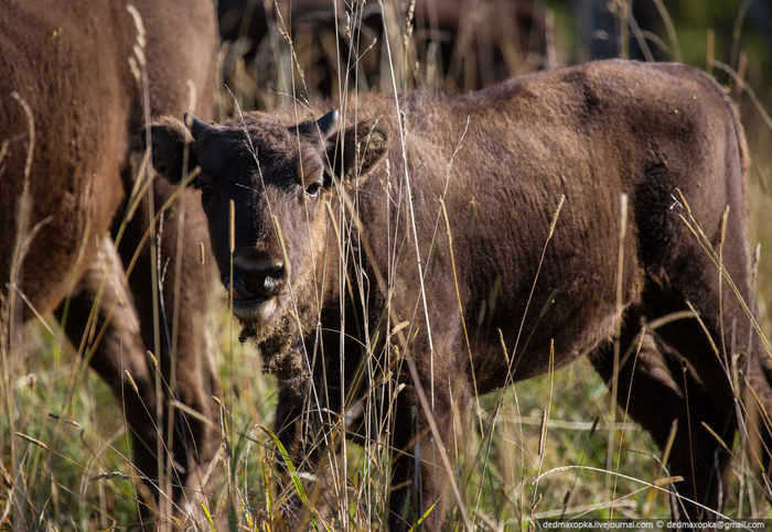 За пару десятков лет из нескольких пар разросшись всего до ~50 особей. Иногда приезжают туристы, поглазеть на зубров издалека, иногда зубры сами ходят бодать туристов, но это я конечно же шучу…На фото зубрёнок показывает язык: