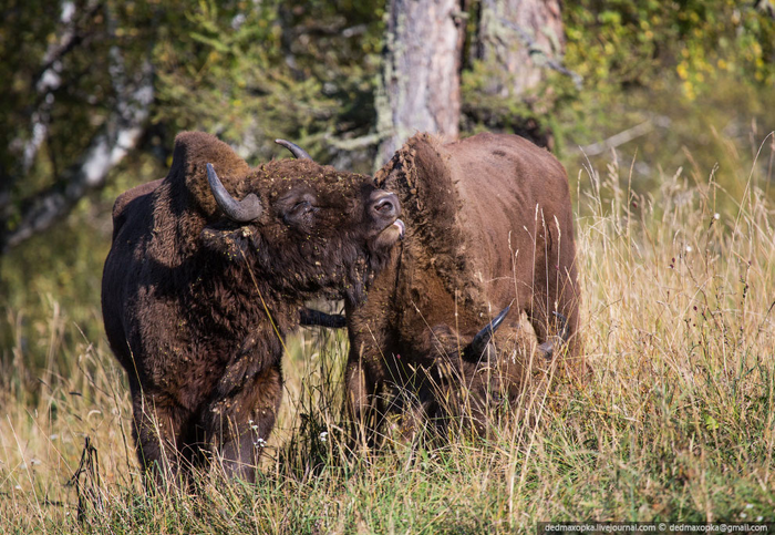 Зубры, они же европейские бизоны, являются самыми тяжелыми и крупными наземными млекопитающими Европы (вес до 1 т) и последними европейскими представителями диких быков (Зубр — краснокнижное животное). Алтай — это конечно не Европа, но сюда их привезли с определенной целью, о которой я расскажу в рамках одного из репортажей: