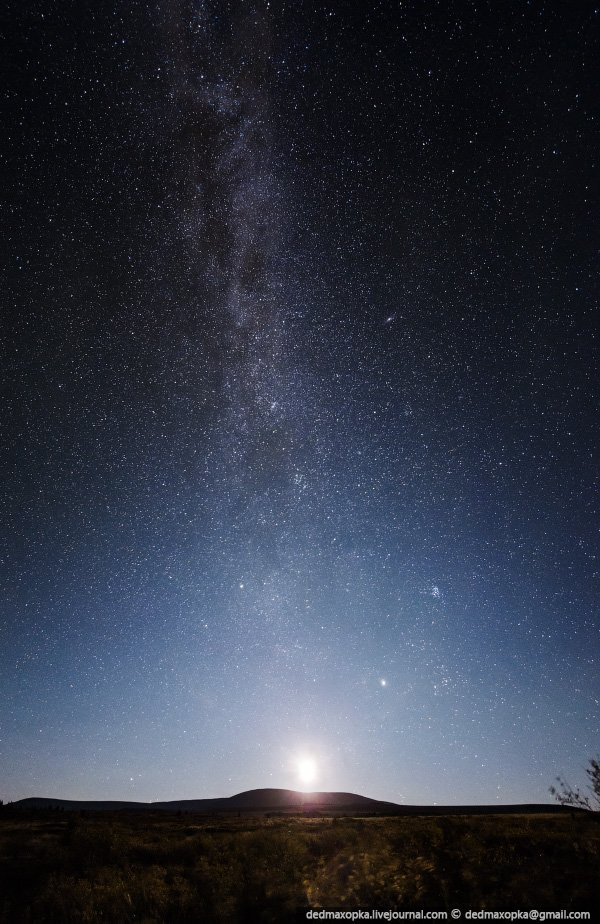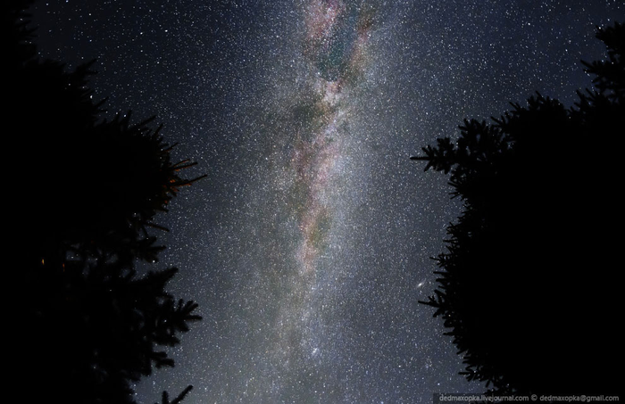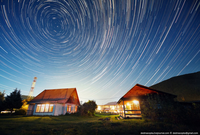 Я был за последний месяц на Алтае дважды, но до Больших гор не добрался, да и к тому же в первый приезд с погодой не повезло. Но зато во второй приезд на небе сутками не было ни единого облака, поэтому я решил экспериментировать со звездами возле избушки, в которой мы жили.