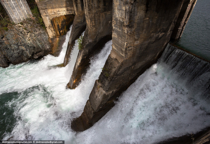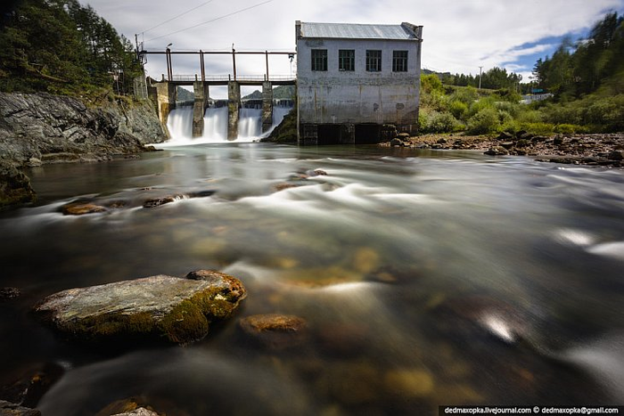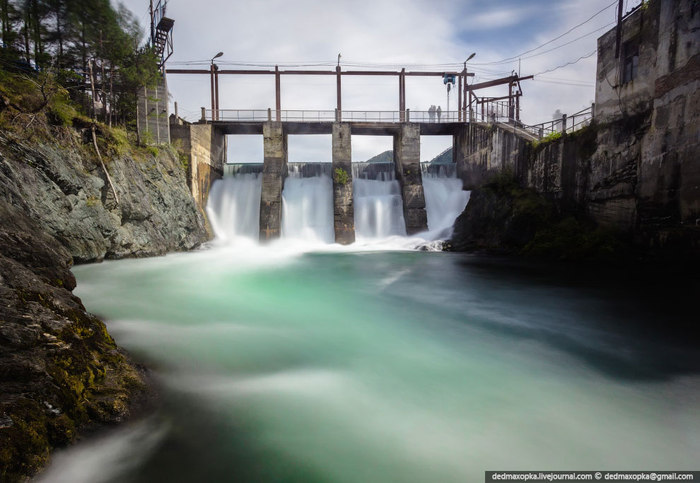 Но одних звезд было бы мало, потому начну сначала с Чемальской ГЭС, которую я тоже успел поснимать. В настоящее время ГЭС остановлена, водохранилище спущено, поэтому здесь идёт постоянный водосброс. Чемальская ГЭС построена в 1935 г. силами заключенных Сибирского управления лагерей особого назначения. На стройке работало до семисот заключенных: