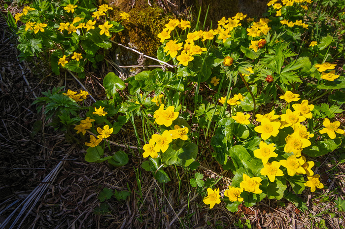 В июле меньше жарков, но больше синих водосборов. В целом температура воды и воздуха выше, это самый жаркий месяц. Ещё можно собирать черемшу.