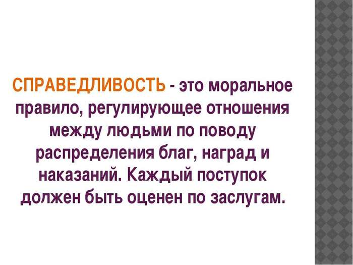 С понятием Справедливости , которое является внешним отражением понятия прав и обязанностей, труда и вознаграждения, заслуг и их признания, преступления и наказания, соответствия роли различных социальных слоёв, групп и индивидов в жизни общества и их социального положения в нём, тесно связано понятие Совести как внутренняя система моральных ценностей и оценок, позволяющая жить и действовать без снижения самооценки.