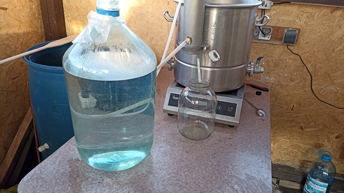 Но раз пообещал, надо пробовать. Первым делом решил сделать просто перегон, чтобы убрать хоть часть запаха и работать уже с белым сырьём, а не "цветным". Градусы мерять не стал, сколько выйдет, столько выйдет.