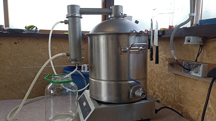 Перед этим немного разбавил в кубе настойки, чтобы вода немного ослабила молекулярные связи. Первые грамм 300 были ужас на запах, переплетение аниса, можжевела и сена. Их в утиль. Остальное отбирал почти до ноля, в конце также полез неприятные запашок.