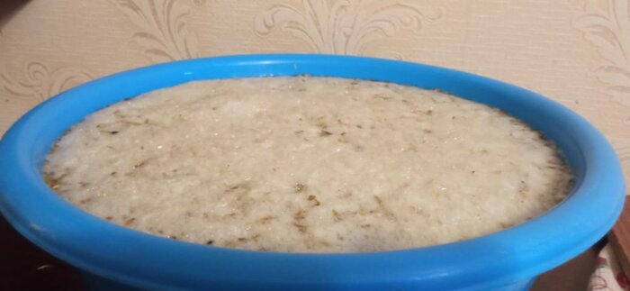 Дальше для разброда взял 1 кг. сахара, растворил его в 5 литрах теплой воды, остудил до 30 градусов и влил всё в таз с пшеницей. Накрыл таз полотенцем, чтобы пыль не попала, да кот не залез и поставил в самую теплую комнату, где окна выходят на солнечную сторону. Температура в комнате примерно 24-25 градусов. Через 2-3 дня можно уже брагу.