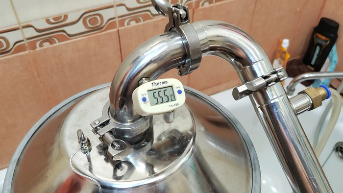 Далее я стал отбирать тело и в качестве эксперимента после 90 градусов чуть-чуть приоткрыл дефлегматор. В струе было около 80 градусов. Так я имитировал шлем (да, наивно, но хотелось посмотреть что будет - у меня все время 91-92 градуса на бражной колонне получается).