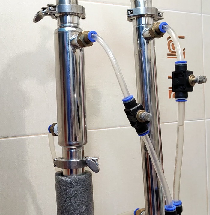 И вот тут получилось разочарование - колонну я не смог нормально настроить. Все время температура повышалась, так что я подозреваю, что спирт нормальный я отобрал, а далее пошли хвосты — слишком маленький был объем спирта-сырца. Так что что получилось, я принял как хвосты и никуда их не стал добавлять - уйдут в другой раз во второй перегон.