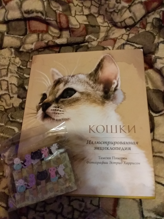 Совершенно потрясающая книга про кошек, которую у меня немедленно отжал король котиков, и прищепочки с котиками!