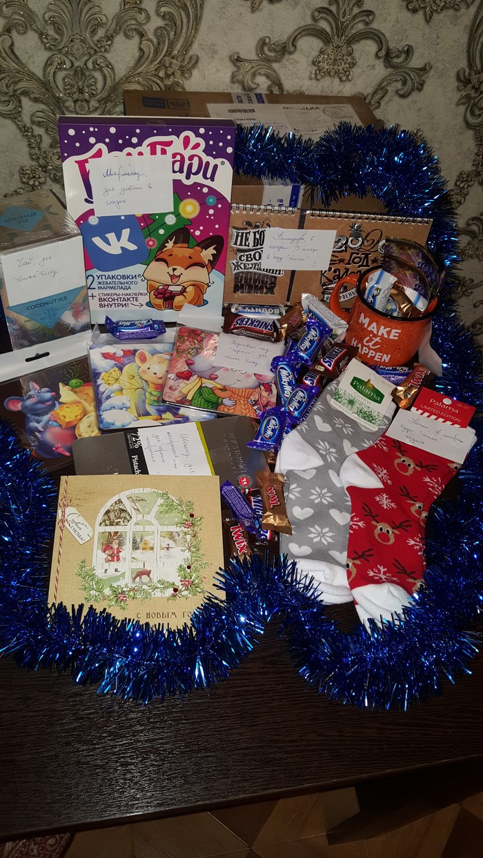 Всем привет и С Наступающим Новым Годом! Участвую в проекте АДМ впервые по совету подруги и очень этому рада!)) Мне попался замечательный Дедушка Мороз! Подписал для меня каждый подарочек. Благодаря ему у меня много сладостей, которые я буду запивать вкусным чаем из безумно красивой кружки! Подставки под горячее с мышатами и календарь просто чудо! А теплые носочки-это именно то, что нужно сейчас в зимние холодные дни в Хабаровске.