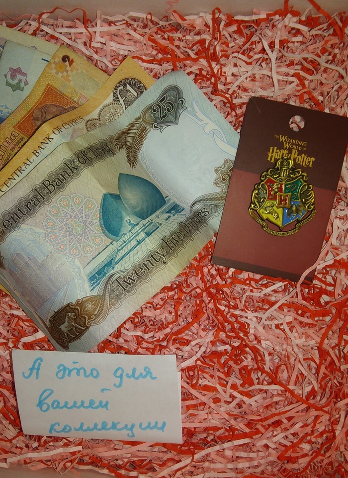Осталась последняя часть подарка. На моменте, когда я добралась до него, мои фитнес-часы зафиксировали пульс в 110 уд/мин, руки начали дрожать, а глаза наполнились слезами умиления и счастья. Самый лучший Санта и его помощница Снегурочка учли, что я Поттероман, значки- и банкноты-собиратель.