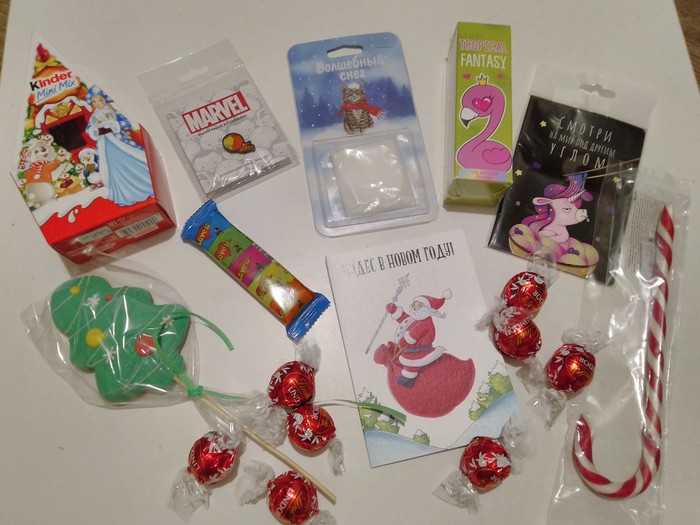 Угадала во всем. Пин с железным человеком!, открытка с прекрасными словами и пожеланиями, сахарная трость (как же без неё), волшебный снег(надеюсь скоро его применим), чудесная обложка на паспорт, гель для душа с блёстками. И конечно же сладкий подарочек!