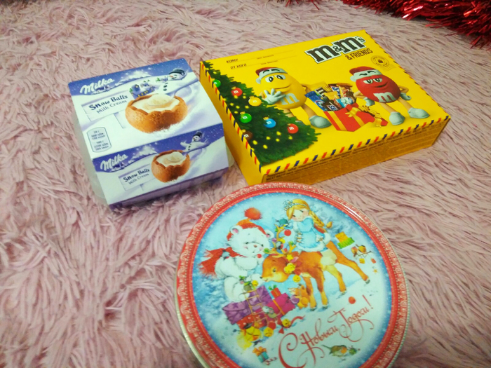 Сладости как мы любим,кто их не любит)))подарок пока не открыли отправиться под ёлку до 31)