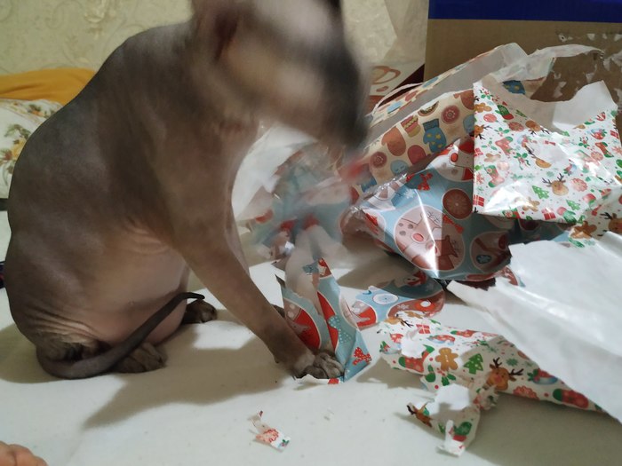 Далее очень важный подарок! Надпись гласит- " великолепной пятерке" . Из всей пятерки разузнать, что же тут, решил самый младший научный сотрудник Кот. И все понравилось))
