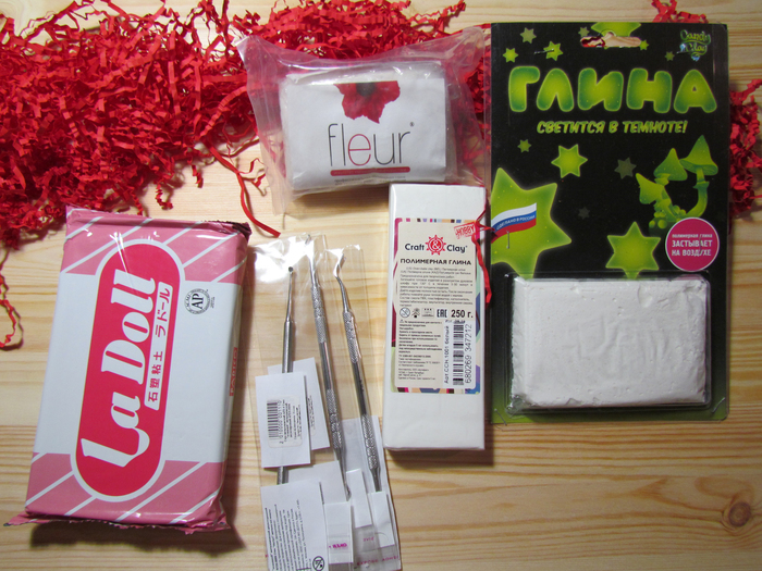 Та-дамм! Признаюсь, я такой роскоши не ожидала...) Самоотвердевающая глина La Doll  (это реально было в списке запланированных, но вечно откладываемых покупок), Fleur (керамическая флористика пока из раздела неизведанного, но с радостью опробую), металлические стеки для лепки (у меня до сих пор их не было, только силиконовые!), запекаемая полимерка Craft and Clay (это добра много не бывает)) и светящаяся полимерка (ну просто обязывает к лепке чего-то волшебно-мистического).