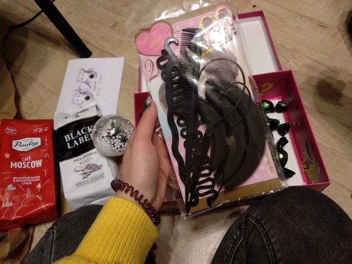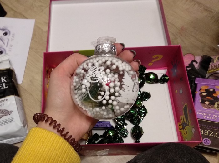 Внутри ждали сладости, кофе (куда же без него ) и прикольный набор для плетения, спасибо! И шар тоже очень крутой :)
