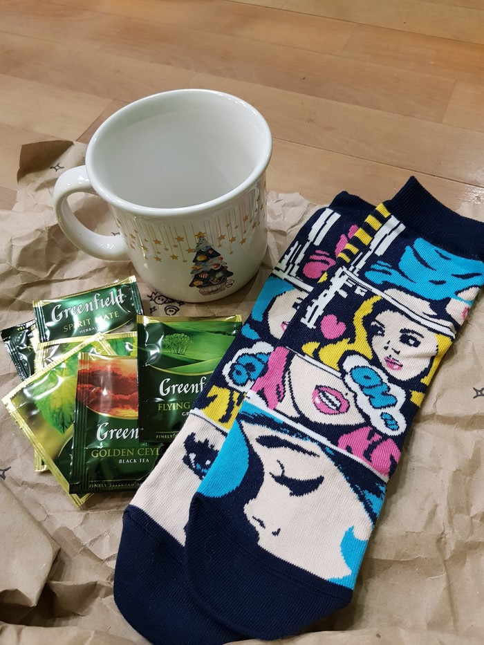 Внутри оказался прекрасный набор для чаепития и чумовые носочки.