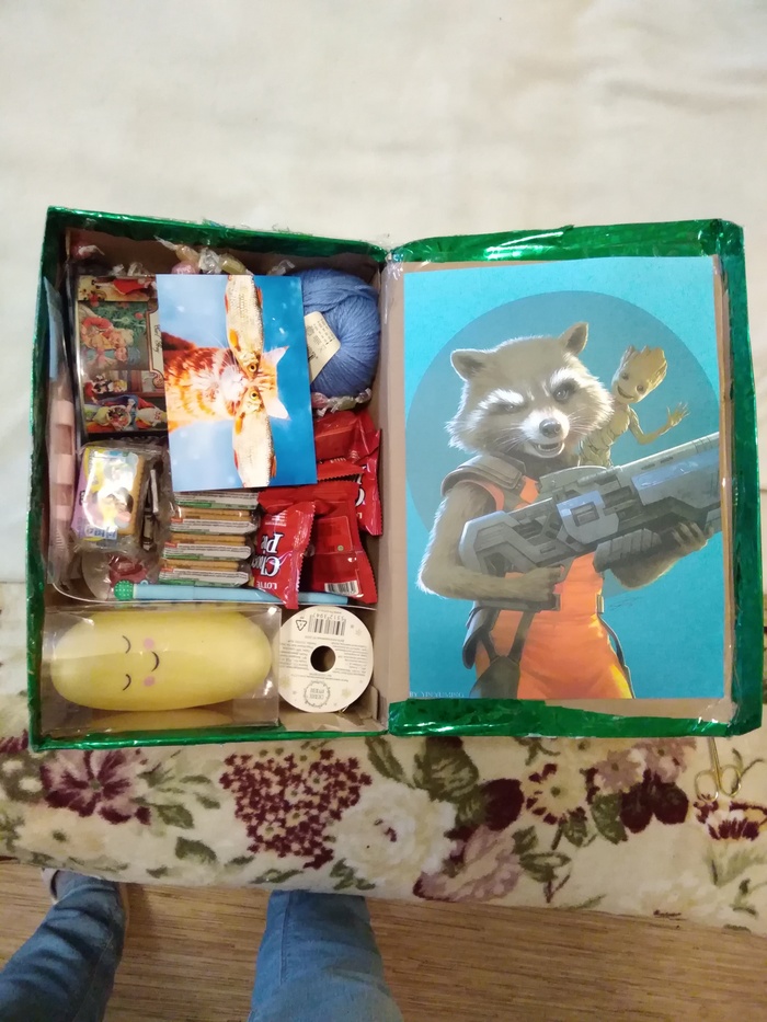 Упакованный в зеленую оберточную бумагу настоящий подарок из-под елки. В воздухе уже начал витать отголосок праздника. Борясь с дрожью в коленках открывали всей семьей. и, не успев нырнуть в содержимое коробки аки Скрудж, я поняла что я явно была хорошей девочкой в этом году. В интересах я писала что Ракета крут и персонажа этого я очень люблю. Та-дам, открываем коробку, и страж Галактики приветливо подмигивает всем собравшимся. Внутри очень теплая открытка от дедушки мороза.