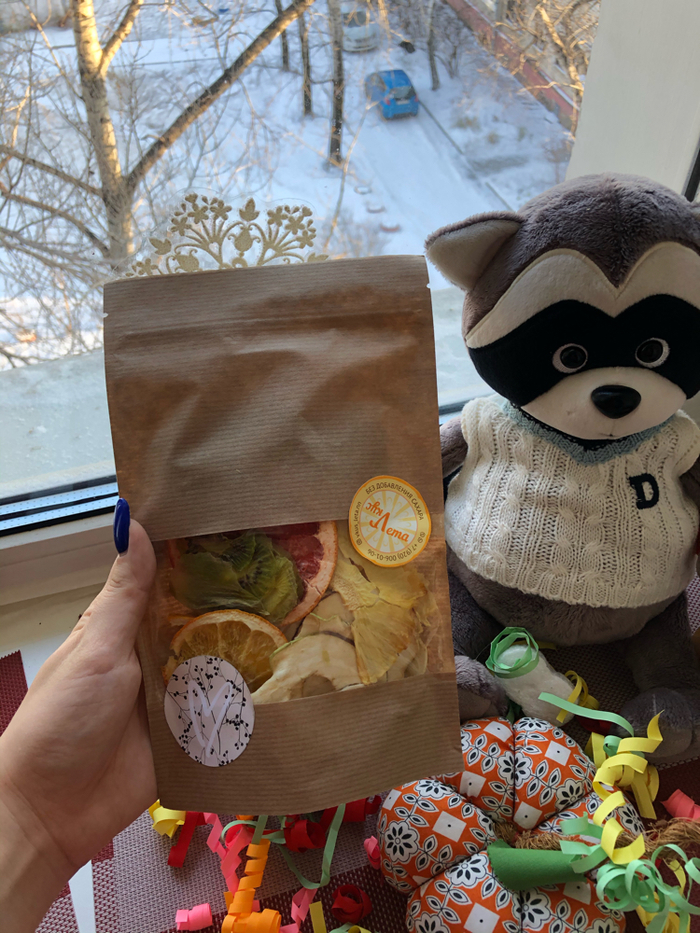Открытие подарка, очень волнительно, но в тоже время хочется поскорее взглянуть, что внутри🙈. Вскрываю коробку, а там приятности😍 сушёные фрукты, тыква 🎃, баночка с конфетами и пожеланиями и наконец, то, от чего я визжала от радости, как маленький ребёнок, плюшевый енот 🦝 😻